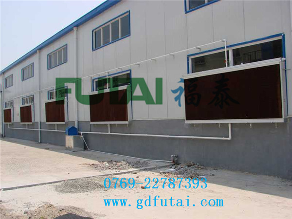 “福泰”濕簾降溫是通過蒸發降溫的一種經濟的降溫方式。干熱空氣通過水簾進入室內,由于水簾內孔壁均勻布滿水膜,這樣室外新鮮空氣穿過水簾時,水簾上的水會吸收空氣中的熱量并產生蒸發現象,使新鮮空氣溫度下降,濕度增加,完成降溫過程,從而使廠房里的空氣變得涼爽、濕潤。負壓風機通過自動控制系統實現風機百葉的自動開啟和關閉達到防塵、防水、美觀的效果。噪音低、風量大、耗電少、降溫效果明顯;既可吹風、也可抽風,質量保證!是廠房等降溫通風的最佳選擇。