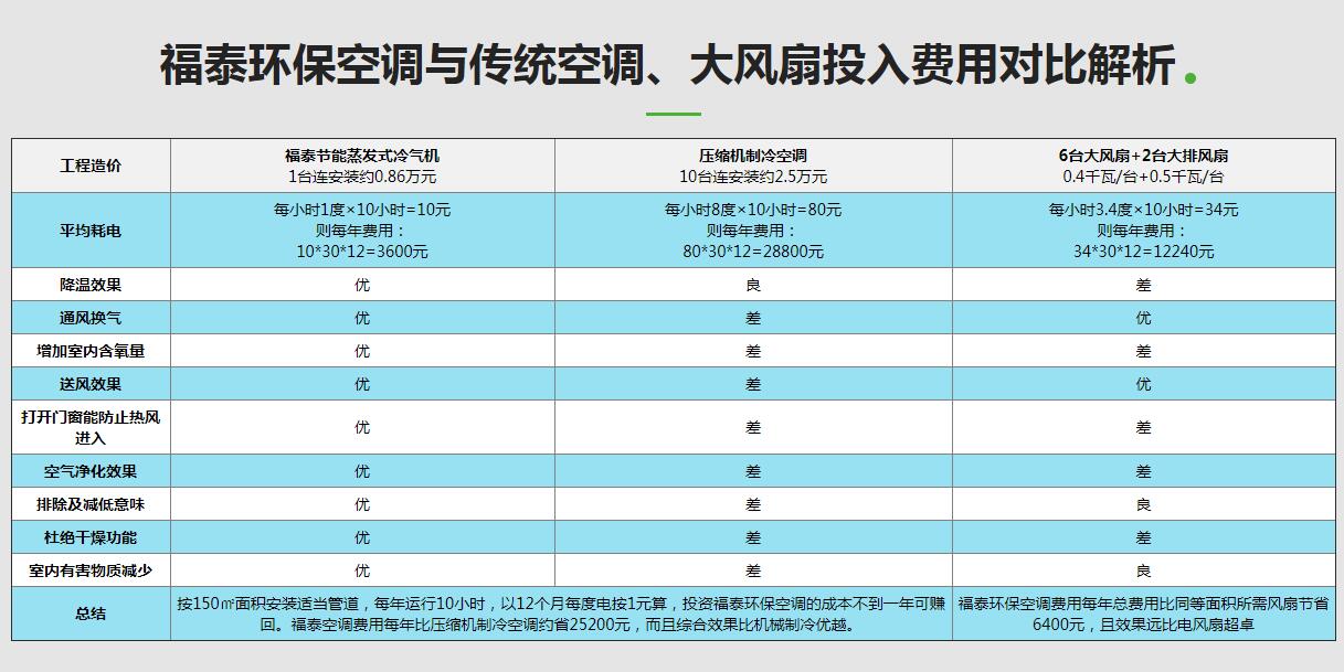 實際的降溫實際效果與安裝環保空調的方案設計是有著非常大的關系的,設計方案工業廠房降溫務必要明白如何計算車間內的換氣次數方式, 及其車間內該怎樣設置適合的環保空調的總數、輸出功率冷熱空氣的對流等,亦或是車間是需要工位降溫或者總體降溫。福泰環保空調依據“水蒸發氣化需要消耗帶走熱量”這一基本原理來降溫,戶外的汽溫越高而環保空調降溫實際效果越顯著。依據不一樣工業廠房對車間環境濕度、換汽需求、項目經費預算的不同,福泰可依據客戶實際情況定制專屬的型號規格的商品及降溫計劃方案。